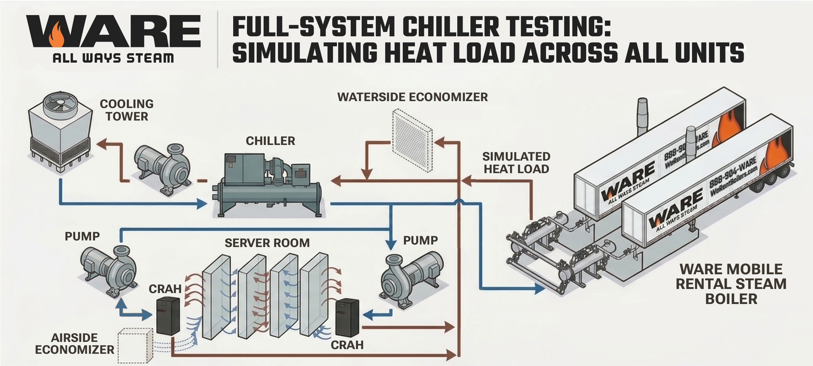 WARE uses mobile hot water rental boilers or mobile steam rental boilers with heat exchangers to simulate the heat loads a cooling system must remove once a data center becomes operational. This allows engineers and contractors to verify that the entire chiller system performs correctly before servers and other mission-critical equipment come online.